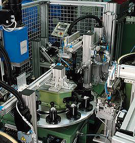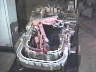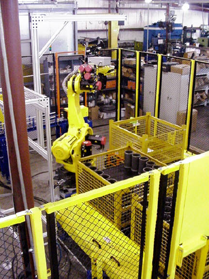 This application involved re-tooling an existing 6-axis robot, to vacuum grip steel blanks, and insert them into a fixture controlled by a servo-pneumatic robot (SPR). The SPR had four basic tasks: move the fixture out to receive a blank, index forward for the first hit, index forward for the second hit, and discharge the finished part.